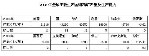加拿大金屬經(jīng)濟小組統(tǒng)計了2008年全球鉬精礦主要生產(chǎn)國的礦山62座,生產(chǎn)能力(金屬量)為19.29萬噸/年。從生產(chǎn)能力來看美國、中國、智利、秘魯位居前四。