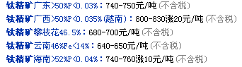 今日國(guó)內(nèi)其他地區(qū)鈦精礦價(jià)格具體情況如下: